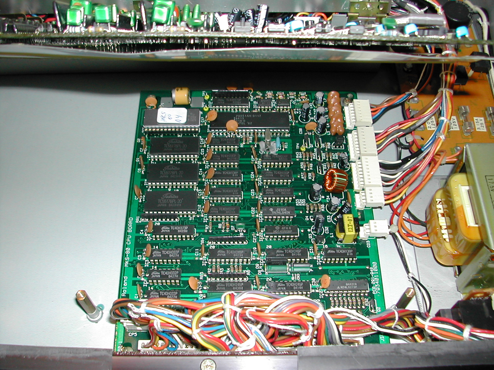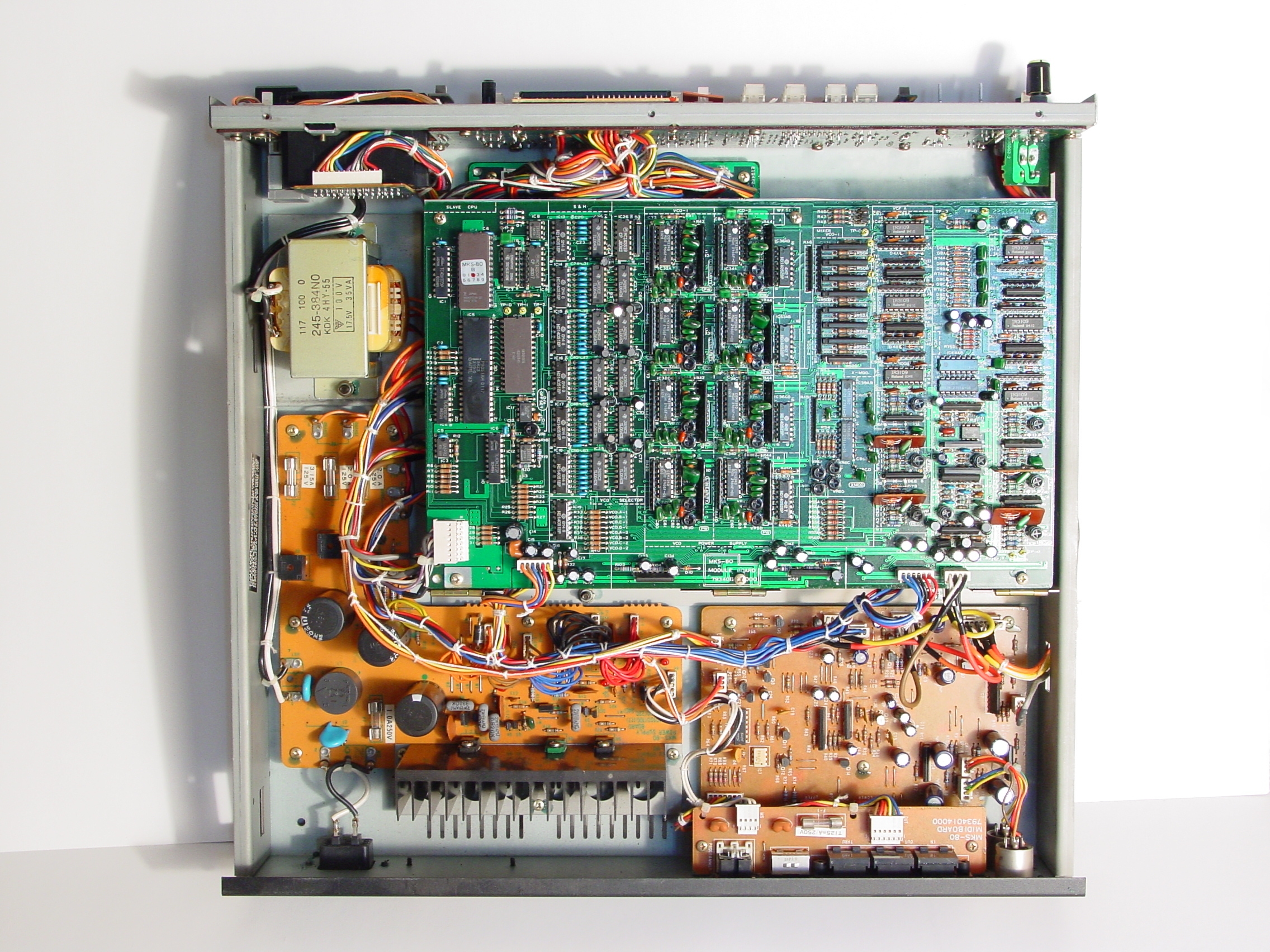 MKS-80 interior view showing one of the voice boards (green), power supply, MIDI and I/O boards (jpeg - 2272x1704) |
